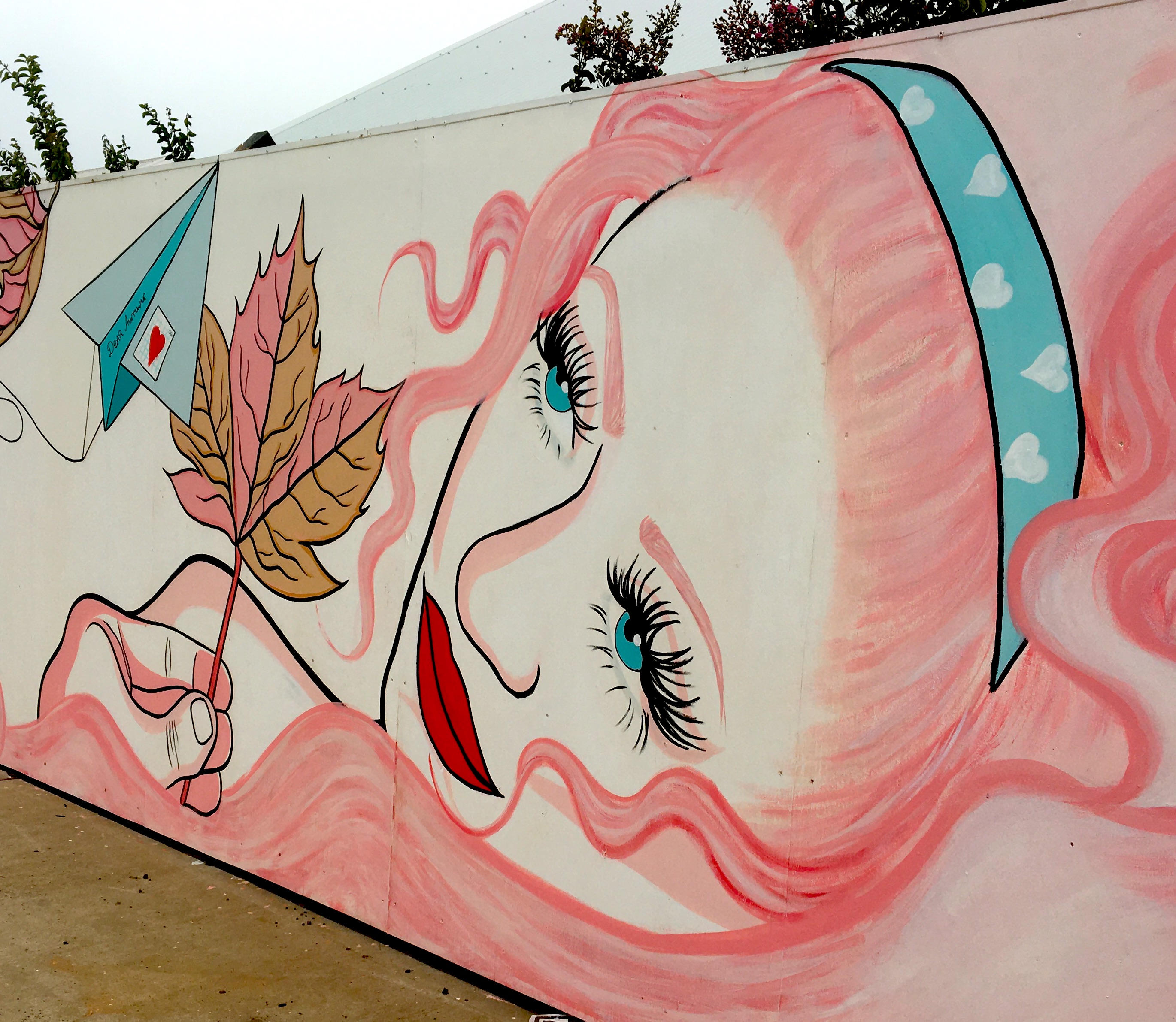 The mural is playful, thoughtful, charming and full of little reference points to the suburban experience so integral, and comfortable, to people’s lives. Even a quick glance reveals, kites, letters and paper planes, brollies and butterflies, plants, leaves and lashes – lots of eyelashes: there’s a distinctive feminine touch to the work.